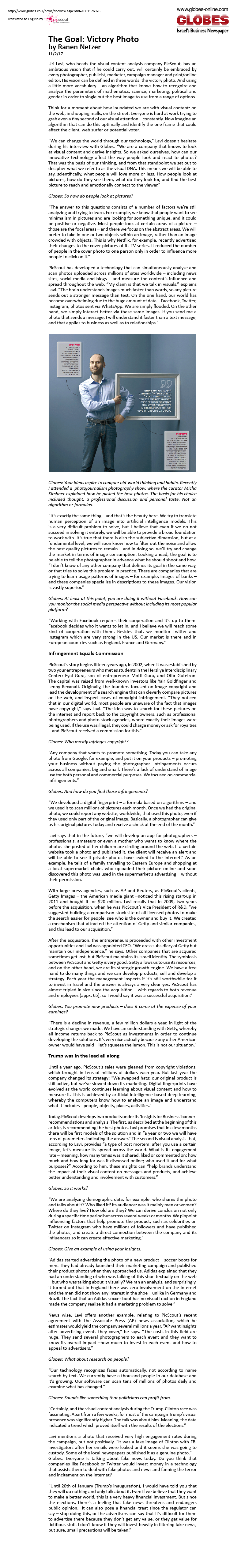 Below is a translated copy of PicScout’s CEO Uri Lavi discussing Visual DNA, visual content analysis and artificial intelligence with Israel’s leading business publication, Globes.